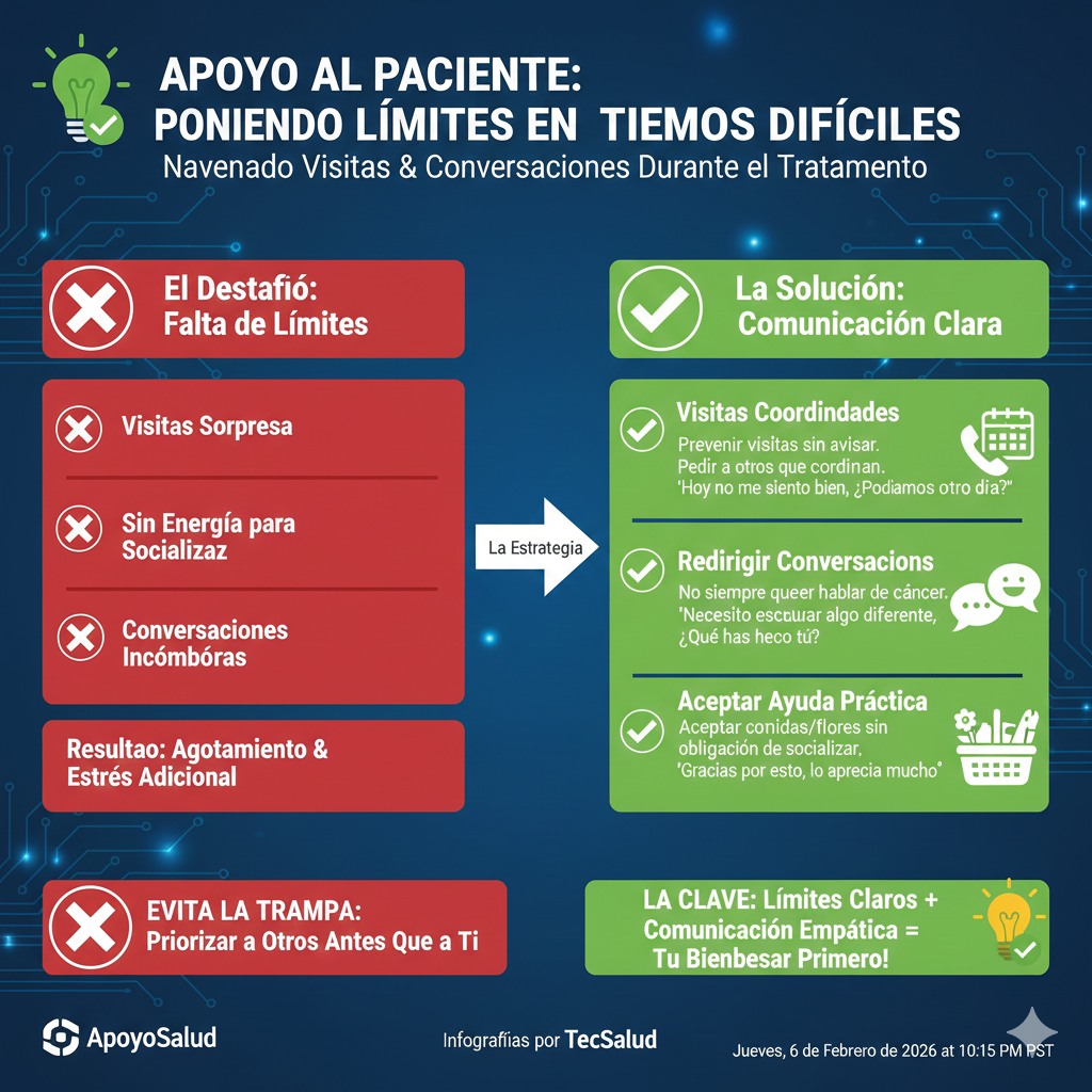 Desarrolla respuestas amables pero firmes que puedes usar cuando necesites espacio. «Aprecio mucho que pienses en mí. Ahora mismo necesito descansar, pero te contacto cuando me sienta con más energía.» «Gracias por querer visitarme. Esta semana es complicada con el tratamiento. ¿Podemos coordinar para el próximo mes cuando probablemente me sienta mejor?»